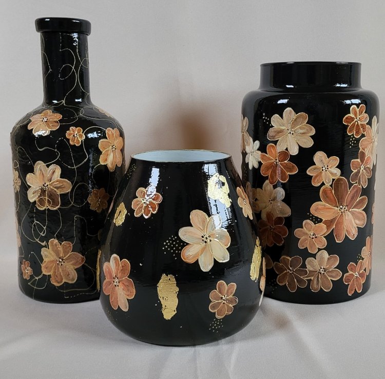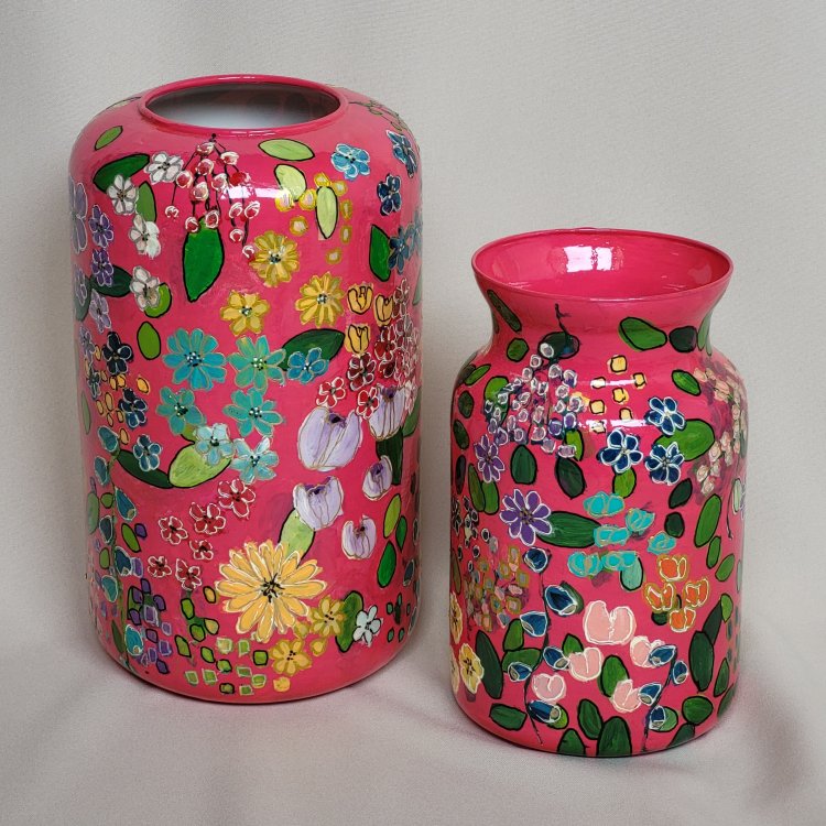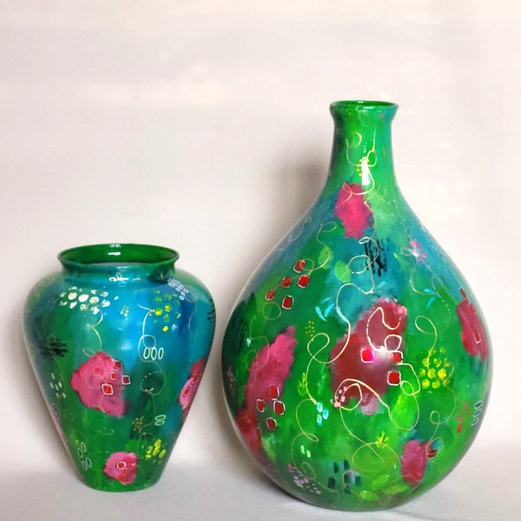 De vazen worden na beschilderd te zijn afgewerkt met een hoogglanslak zodat ze waterbestendig zijn en geschikt zijn om te gebruiken als bloemenvaas.