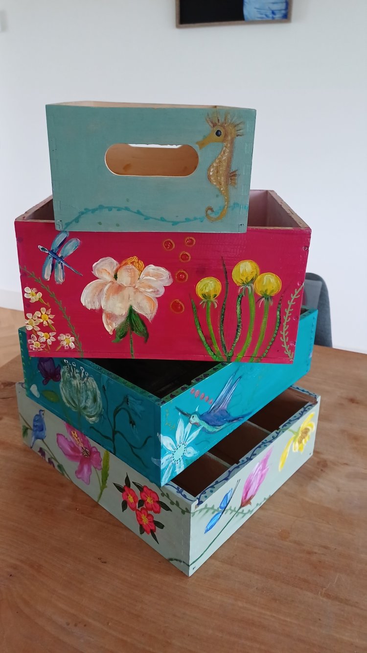 Mijn werk is vlot en vrij, het hoeft niet op een foto te lijken. Maar het verdient wel de suggestie van details, een vacht van een dier of de lichtweerspiegeling op een appel. Ik schilder veel op hout ipv canvas. Dat kunnen zijn wijnkistjes, dienbladen of planken. Inspiratie haal ik uit de natuur, vogeltjes, groenten en bloemen uit mijn eigen (moes)tuin. Ik wil graag dat mensen blij en vrolijk worden van mijn creaties.