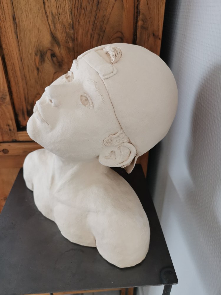 Op een oudejaarsfeestje kreeg ik een tip over een beeldatelier in Berlaar, "De volle zon". (België) Ik wilde wel een nieuwe uitdaging aangaan, namelijk... boetseren. Ik werd hartelijk verwelkomd door Miek, die me de eerste blok klei liet bewerken. Wat er dan gebeurde, zal ik niet gauw vergeten. Uit de klei verscheen een klein jongenshoofd. "Als dit jouw eerste beeld is, heb je talent!" Een nieuwe hobby was geboren. In elke blok klei zit reeds een figuur verborgen. Ik heb de kans om dit persoontje met de wereld te laten kennismaken. Hoe mooi is dat. In elk beeld vind ik een beetje van mezelf terug. Het zijn mijn schatten en ik hoop dat ze elk een plaatsje vinden waar ze de ruimte krijgen om te stralen.